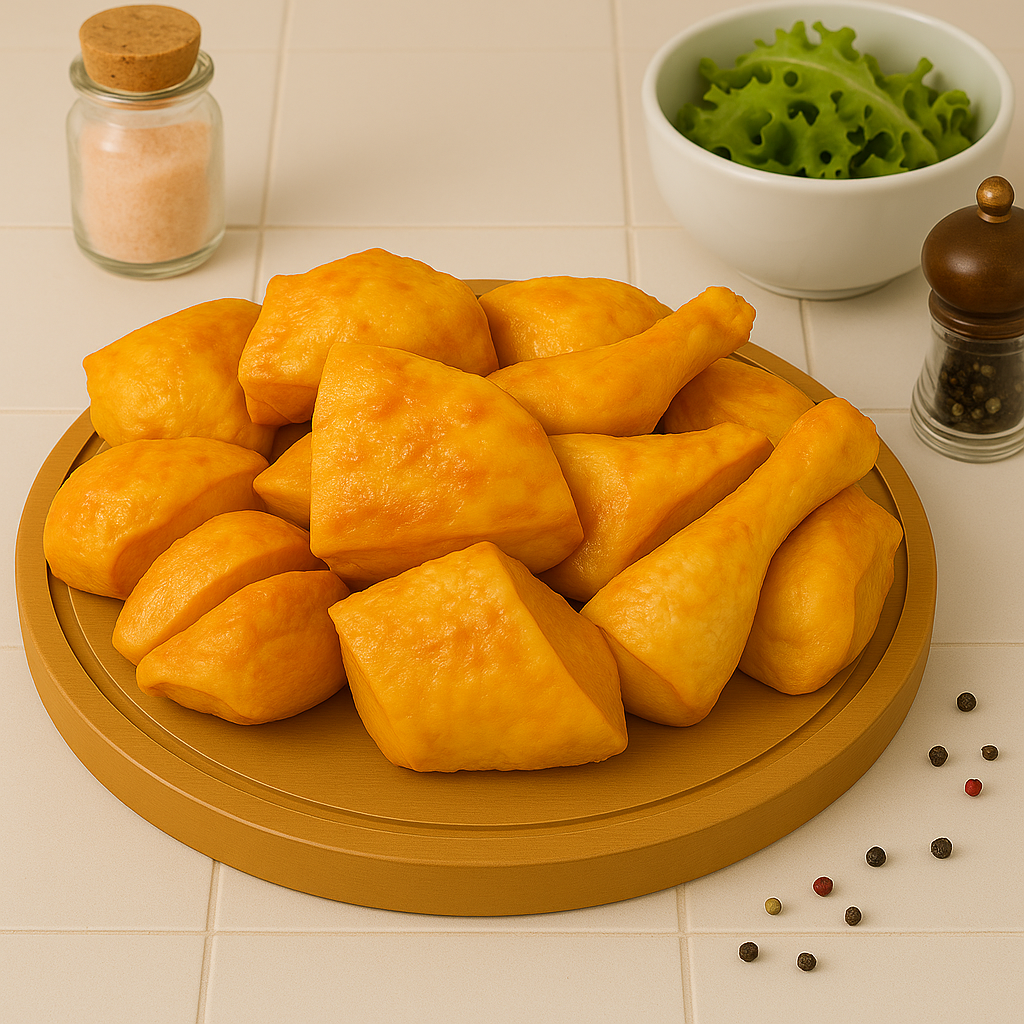 Sourced from cross-breed country chickens, this meat is naturally flavorful and tender. Skin-on cuts are lightly marinated with fresh turmeric, giving it a smoky, earthy aroma and a rich golden color — perfect for traditional curries and grills.